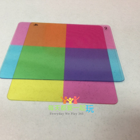 在開始玩桌遊之前,我個人建議可先給小朋友變色卡,讓他們自由探索透明色卡堆疊所呈現的色彩的組合。然後再出題目請他們試試看,怎麼做才會產生紫色、橘色、綠色呢?
