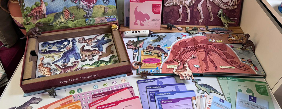 「恐龍大百科」內附劍龍磁墊,能夠讓孩子搖身成為考古學家,藉由觀察及比對慢慢地拼湊著劍龍的身體和骨骼;盒身背蓋為史前世界磁性遊戲板,孩子能將不同種類的小恐龍在史前世界上遊走及化石的擺放,搭配恐龍迷你百科全書還能進一步了解化石如何形成,這組附件中有個值得一提的是恐龍提示卡及貼心的磁性貼條(讓提示卡能直接放在遊戲板上玩),每張卡片上除了附上各種恐龍英文名稱及詳細的特徵和習性資訊(可搭配迷你百科全書互動Q&A一起複習)外,藉由影子圖示的提示能更快讓孩子尋找到正確的恐龍,絕對會是想認識恐龍或恐龍迷學習的好幫手。