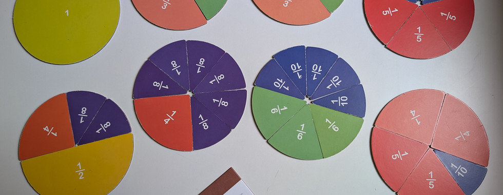 「動手學分數板」則著重在分數(除法)認知,將部分到整體的概念結合日常中具代表性的圓形物體(如:pizza、西瓜、鬆餅等)製成7種磁性分數板(搭配分數海報學習不同分數的英文用語),當逼真的磁性木板擺上美味的水果或食物分數卡時,不僅能練習分數等價及比較關係(如1片1/3=2片1/6、1片1/2>1片1/4等),還能讓孩子在假扮遊戲中不知不覺理解分數(搭配Make a Circle 卡片能玩出更多分數拼盤變化)及結合現實生活經驗中練習販售商品與顧客應答的社交技能,實際觀察3歲的孩子就已經能夠從圖形的觀察除錯和判別能不能完成一個完整的圓(如:拿了不同分數的分數板拼了幾個後會發現缺一小角),而有基礎數感的大班孩子在看Make a Circle 卡片的題目能夠更快速且正確的完成一個圓。另外,家長指南中也提供一個隱藏版玩法,不同的分數板背面其實有不同素面的顏色,可以帶著孩子玩色彩認知及幾何形狀創意拼圖遊戲。